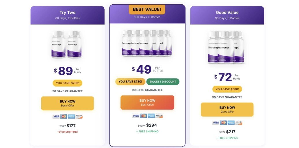 Take advantage of this limited-time offer and get your Neurocept™ bottles delivered at no extra cost. Whether you choose the 3-bottle or 6-bottle package, shipping is absolutely free, making it even easier to experience relief without worrying about additional expenses.